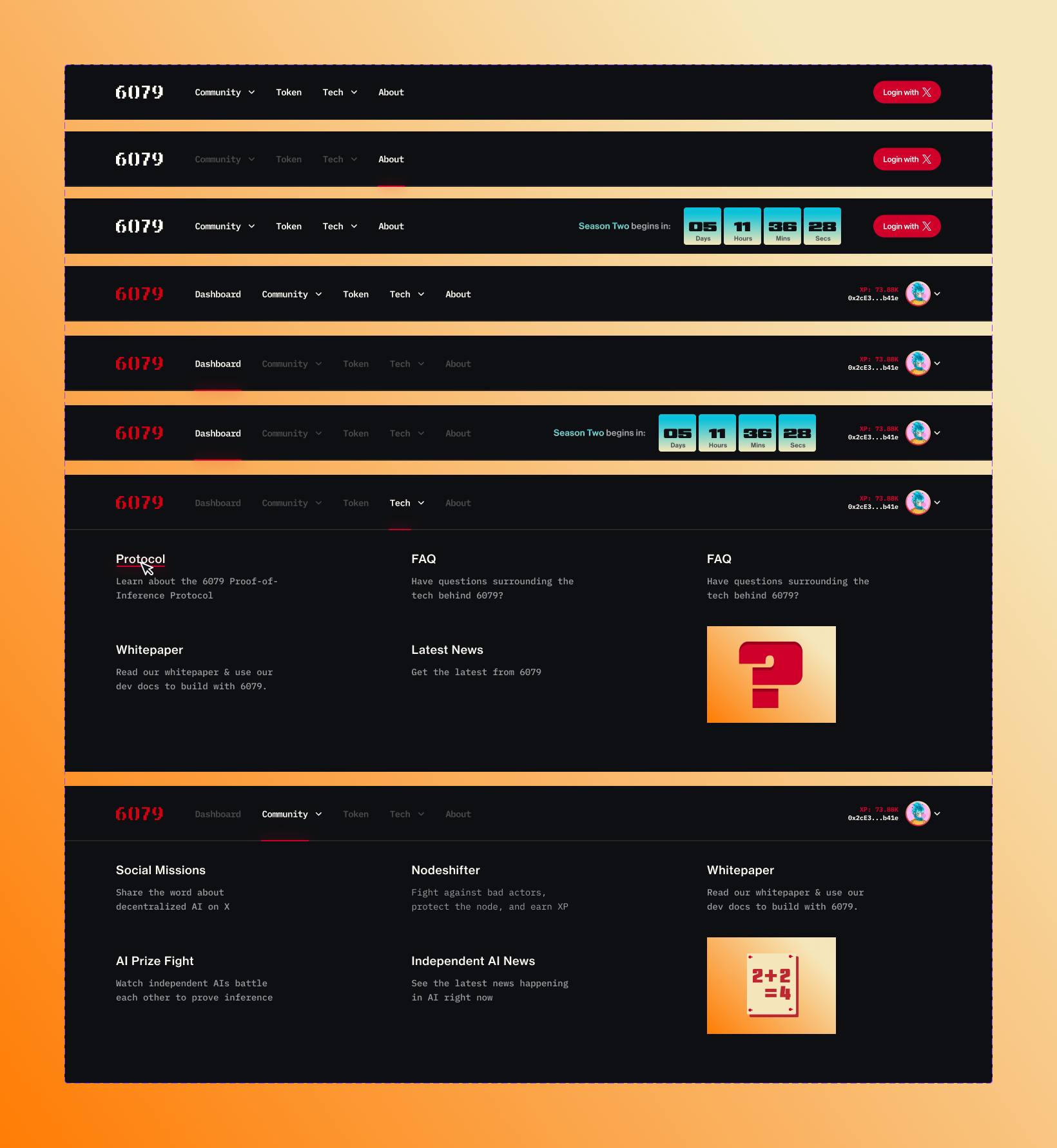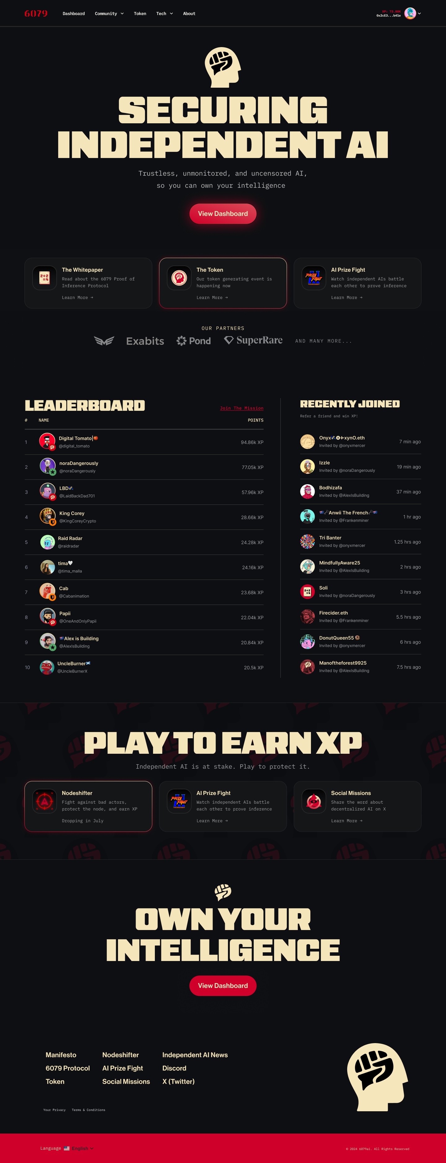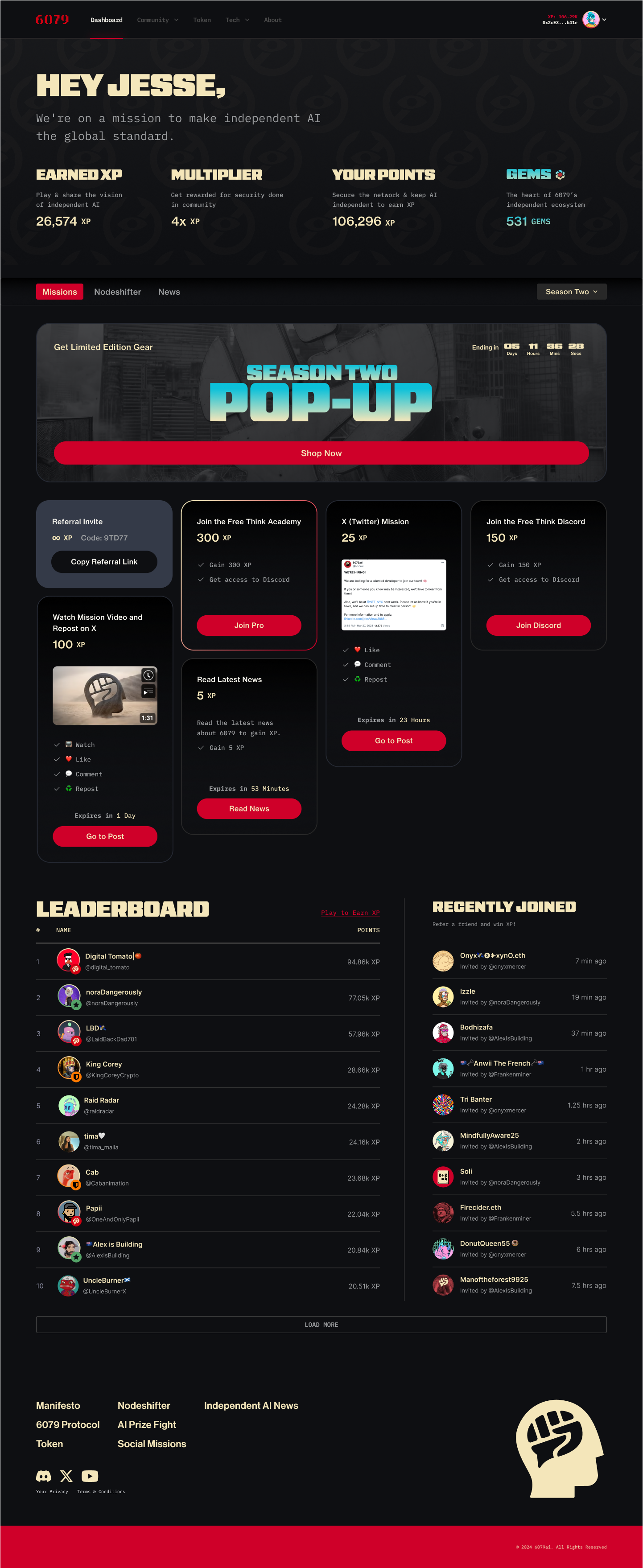 6079 AI was a social campaign to raise awareness of decentralized AI heavily influenced by the book 1984. We designed a social game using X that gave people the chance to gain XP for sharing posts and running various missions. In Season Two, we introduced a custom currency to be used for purchasing limited edition swag.